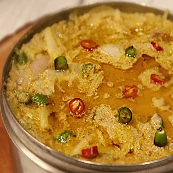 রান্নার শেষে ১ টেবিলচামচ কাঁচা সর্ষের তেল ও কাঁচালঙ্কা কুচি ছড়িয়ে মেখে নিন।